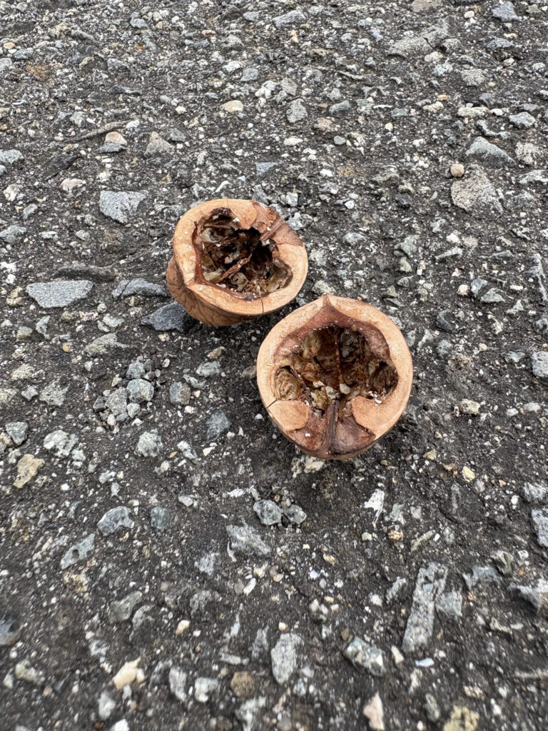 割れた胡桃の殻を見たところキレイに割れてるので上から落としたりつついたりひてして割ったのでしょうか。中身はもちろん食べられた後でした。