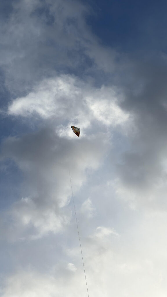 子供の頃にした凧揚げは小学校の運動場で走って風を集めてましたが、大人になるとなんとなくコツが分かるのか、そんなに走らなくても凧が風に乗ったと手で感じるとそのまま勢いに乗せて、凧糸のテンションを感じながら上げていくと、あっという間に上空へ舞い上がりました。
